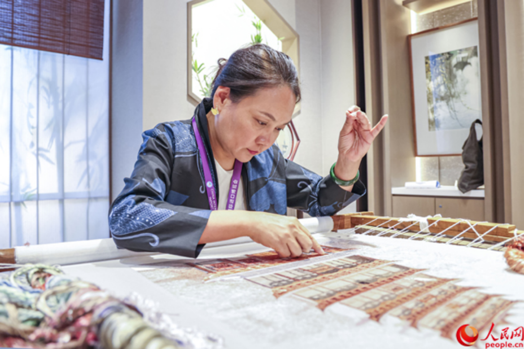 鄒英姿正在繡《花開敦煌》 ·  人民網記者 王初攝