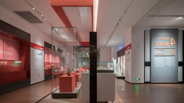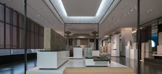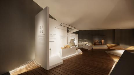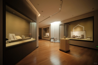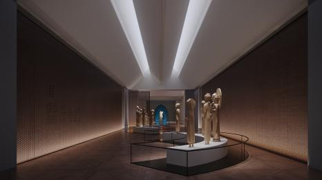 展廳以現代簡約風格為基底,解構重組江南文化內涵,模糊文物與空間界限。融江南造園手法于空間規劃,從“形、色、光、質”維度飾以現代材料與傳統工藝,打造寧靜通透、靈動舒適的觀展空間。